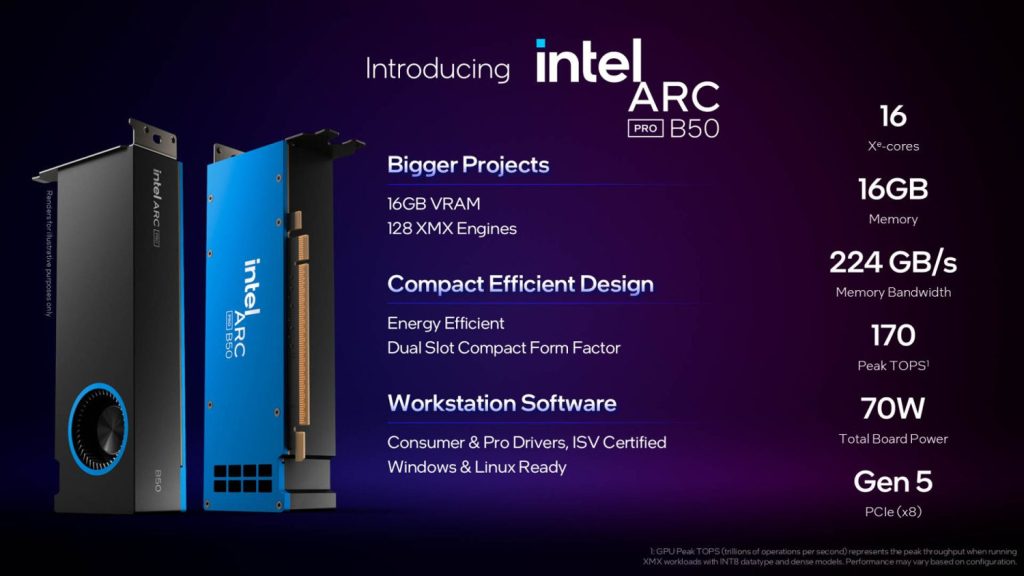 Intel has launched the Arc Pro B50 (16 GB) and Arc Pro B60 (24 GB), two new professional desktop GPUs built on its Xe2 ‘Battlemage’ architecture, featuring Intel Xe Matrix Extensions (XMX) AI cores and advanced ray tracing units.