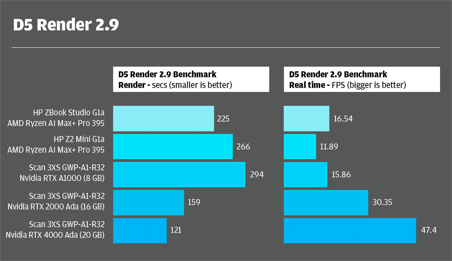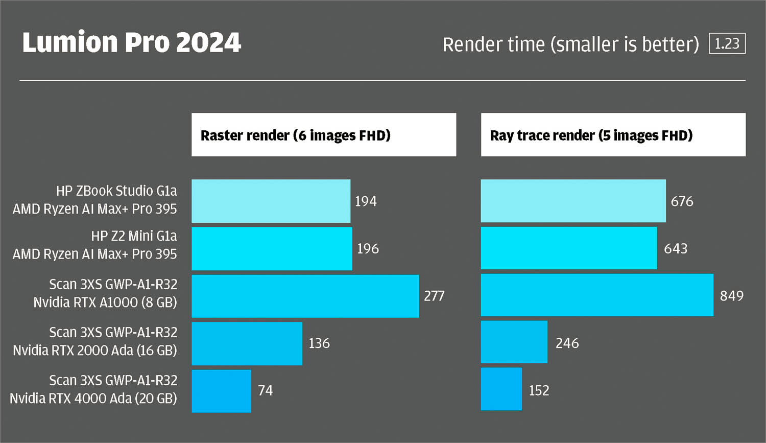 The Z2 Mini G1a impressed in D5 Render, completing scenes 15% faster and delivering a 39% boost in real-time viewport frame rates. Twinmotion also saw a notable 22% faster raster render time, though in Lumion, performance remained unchanged.