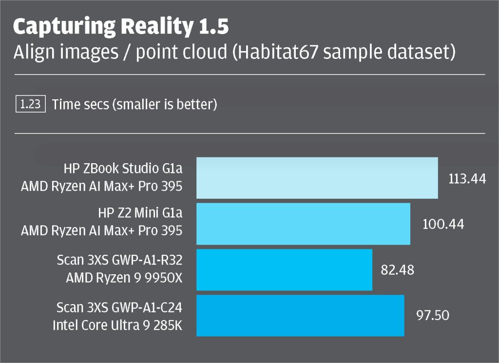 But how does the Z2 Mini G1a stack up against larger desktop towers? AMD’s top-tier mainstream desktop processor, the Ryzen 9 9950X, shares the same Zen 5 architecture as the Ryzen AI Max+ Pro, but delivers significantly better performance. It’s 22% faster in Cinebench, 18% faster in Capturing Reality, and 15–33% faster in Solidworks. But that’s hardly surprising, given it draws up to 230W, as tested in a Scan 3XS tower workstation with a liquid cooler and heatsink roughly the size of the entire Z2 Mini G1a!