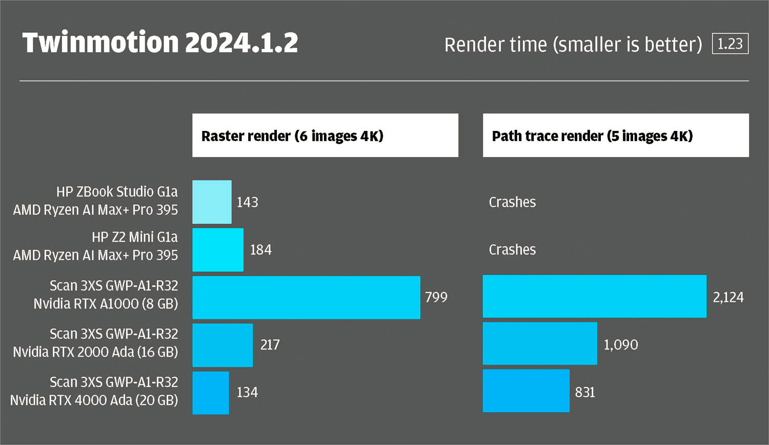 Its real advantage appears when memory demands grow: with 32 GB available, the Radeon 8060S can handle larger datasets that overwhelm the RTX A1000 (8 GB) and even challenge the RTX 2000 Ada Generation (16 GB) in our Twinmotion raster rendering test. Path tracing in Twinomtion, however, caused the AMD GPU to crash, highlighting some of the broader software compatibility challenges faced by AMD, which we explore in our ZBook Ultra G1a review.