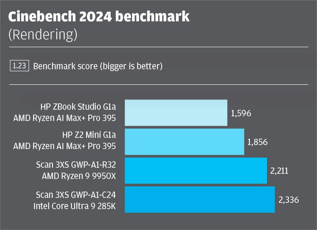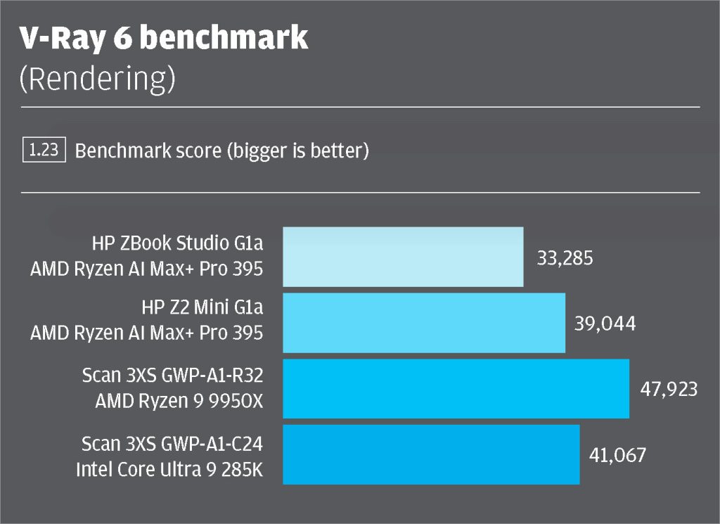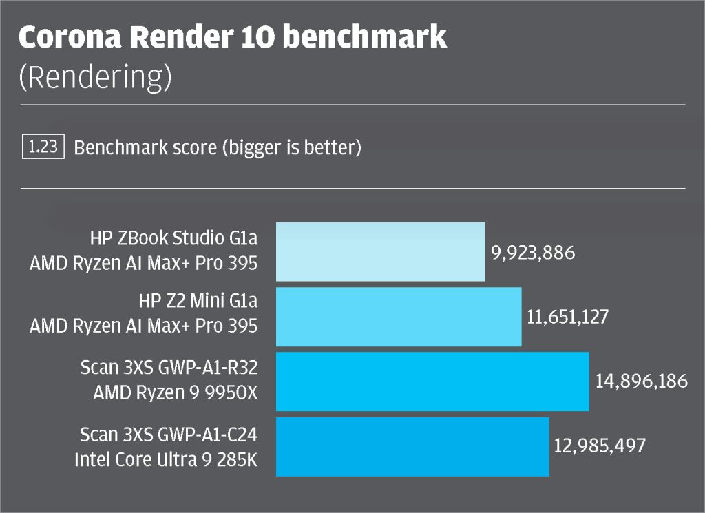 It was only in multi-threaded tests where we started to see a difference and that’s because the Z2 Mini G1a pushes the AMD Ryzen AI Max+ Pro 395 processor much closer to 150W. When rendering – a highly multi-threaded process that makes full use of all cores – the Z2 Mini G1a was around 16-17% faster in Corona Render 10, V-Ray 6.0, and Cinebench 2024.