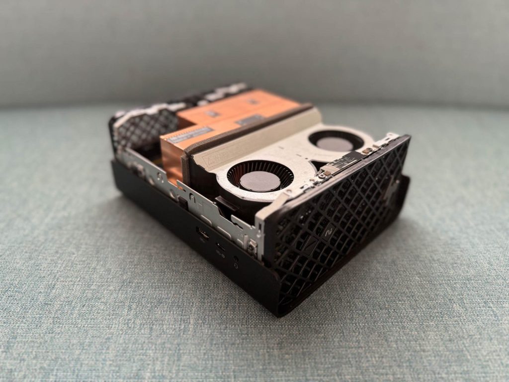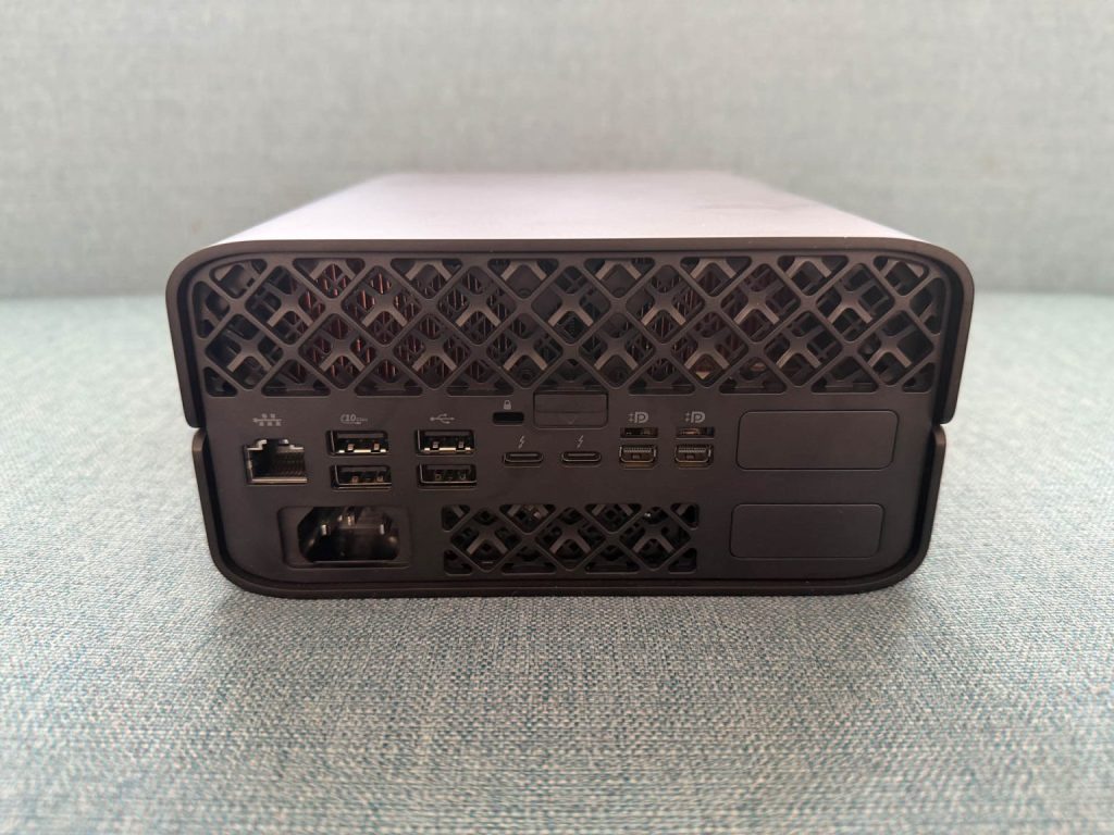 Despite its compact form factor, the Z2 Mini G1a doesn’t skimp on connectivity. At the rear you’ll find two Thunderbolt 4 ports (USB-C, 40Gbps), two USB Type-A (480Mbps), two USB Type-A (10Gbps), two Mini DisplayPort 2.1, and a 2.5GbE LAN. For easy access on the side, there’s an additional USB Type-C (10Gbps) and USB Type-A (10Gbps).